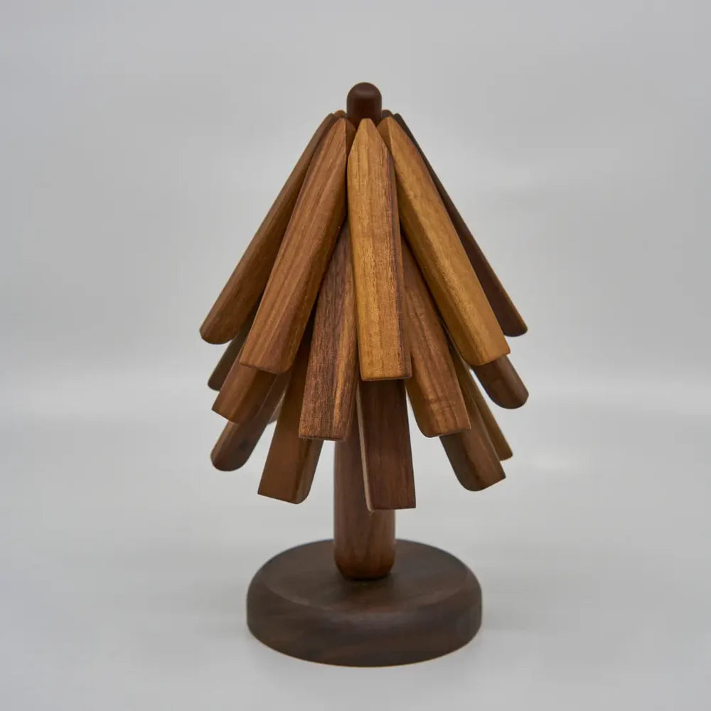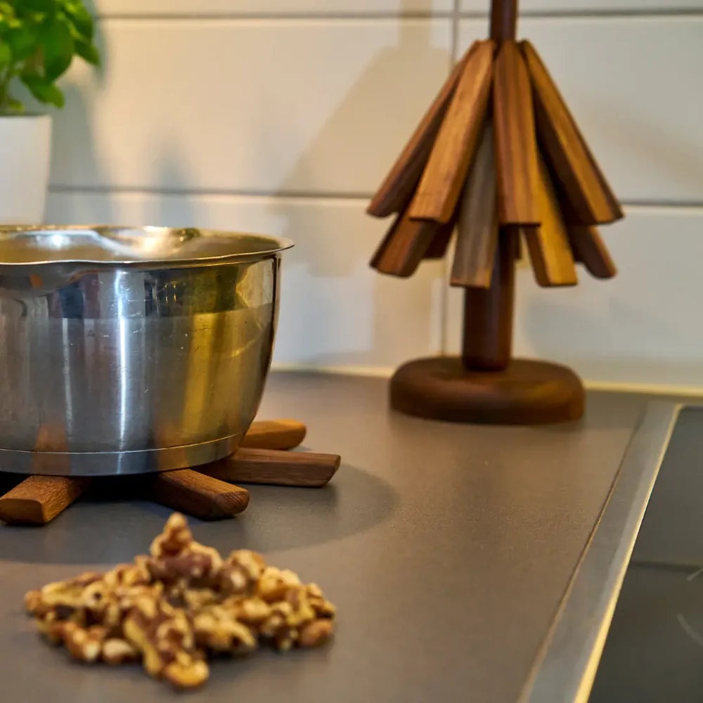 Gi kjøkkenet ditt et løft med en perfekt kombinasjon av funksjon og stil! Vårt gryteunderlag, laget tre, er ikke bare bærekraftig – det er også en elegant løsning som gir de ellers glemte gryteunderlagene en verdig plass. Si farvel til rotete skuffer og hei til et organisert, miljøvennlig hjem som stråler av naturlig sjarm. Gjør kjøkkenet ditt både praktisk og innbydende med et snev av naturens beste!