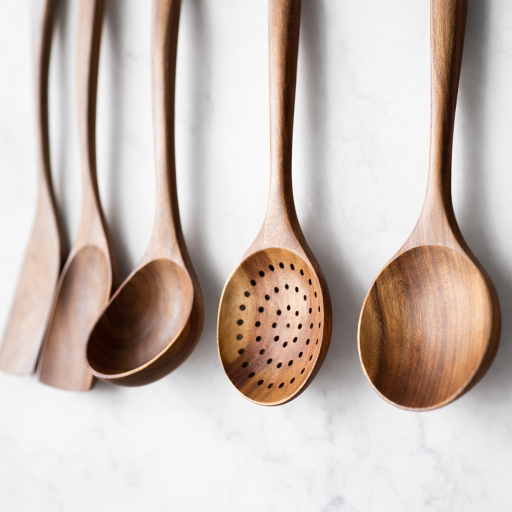 NaturKjøkken-redskapene er omsorgsfullt behandlet med naturlig olivenolje og inneholder ingen skadelige kjemikalier. De naturlige oljene i treverket gjør redskapene motstandsdyktige mot vann, enkle å rengjøre og svært holdbare. Med et bærekraftig design og tidløs estetikk bringer de både funksjonalitet og en varm, naturlig skjønnhet til kjøkkenet ditt.